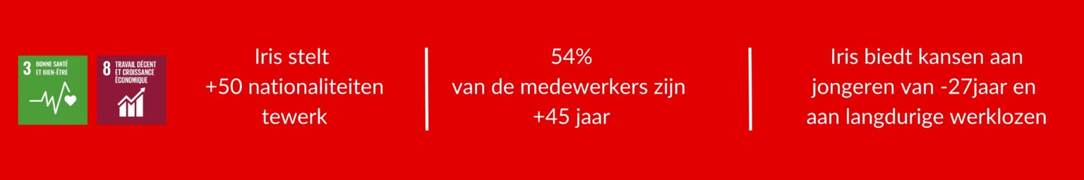 Iris is een bedrijf dat inclusie en diversiteit bevordert. Iris heeft reeds verschillende acties ondernomen met betrekking tot menselijke duurzaamheid. De tewerkstelling van vluchtelingen, waarvoor wij een prijs hebben gekregen is hier een voorbeeld van. Een aantal andere voorbeelden zijn de diverse tests en tewerkstelling van gehandicapten of de organisatie van een jobday in samenwerking met Talent2Connect waarbij wij zogenaamde kansarmen hebben ontmoet die wij hebben gecoacht en aan wie wij een werkaanbieding hebben gedaan.
